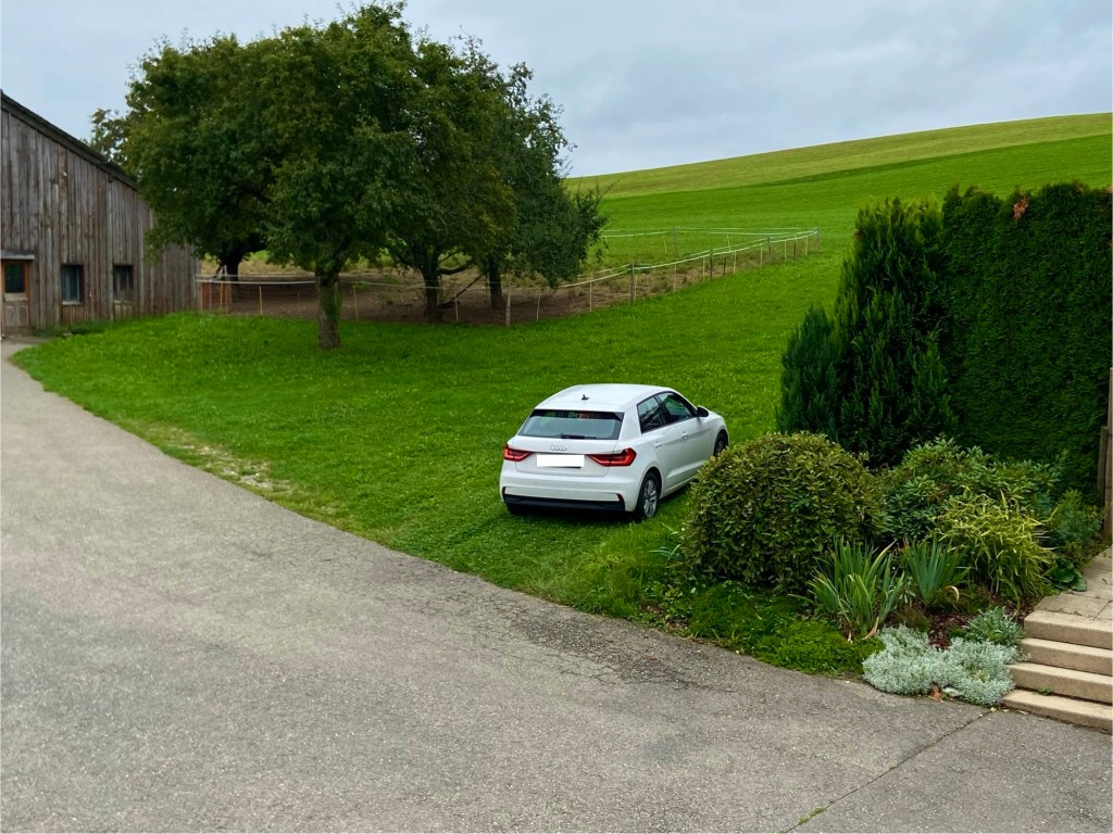 En arrivant à la ferme, repérez le panneau “Œufs fermiers” (voir photo 1), puis tournez à gauche. La parcelle d’herbe se trouve environ 50 m plus loin, sur votre droite. Vous pouvez vous parquer gratuitement à l’endroit indiqué sur la troisième photo. La place est dans l’herbe, pensez donc peut-être à ne pas mettre vos plus belles chaussures…😉