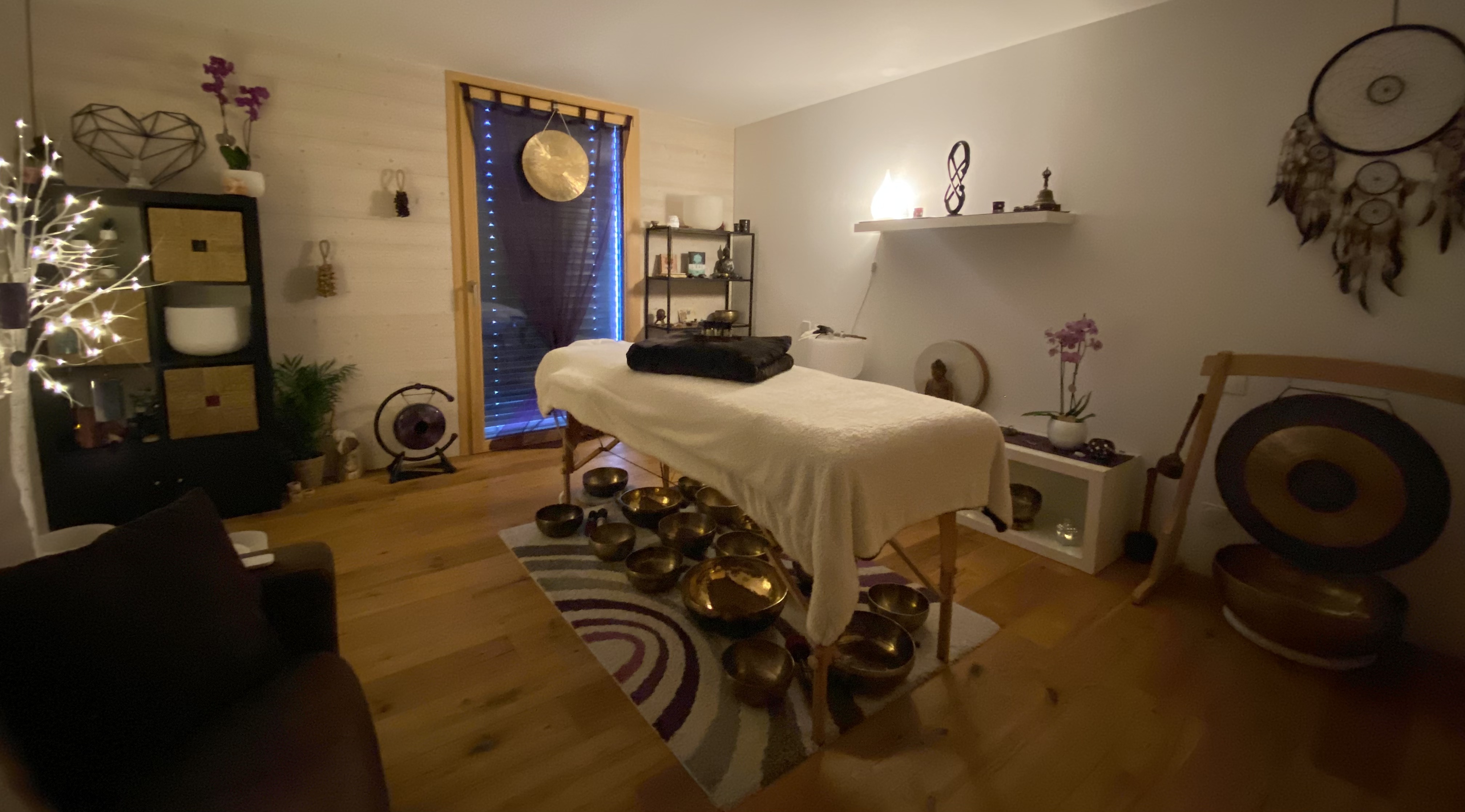… est une approche thérapeutique douce et puissante à la fois, qui utilise les vibrations sonores pour restaurer l’équilibre global du corps et de l’esprit. En créant un espace de calme profond et de résonance intérieure, les sons et les vibrations, en résonance avec notre structure énergétique et corporelle, peuvent dénouer des tensions profondes, remettre à leur juste place des émotions retenues et restaurer l’équilibre intérieur.